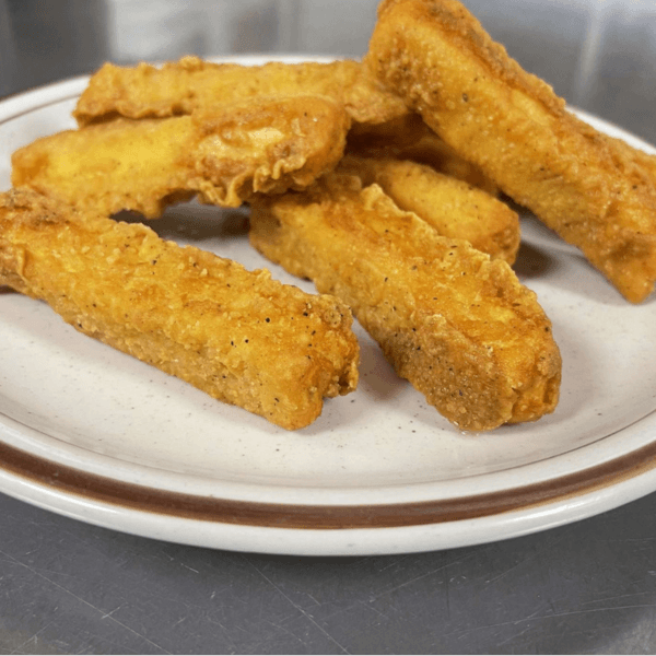 Lightly battered and fried chicken strips.